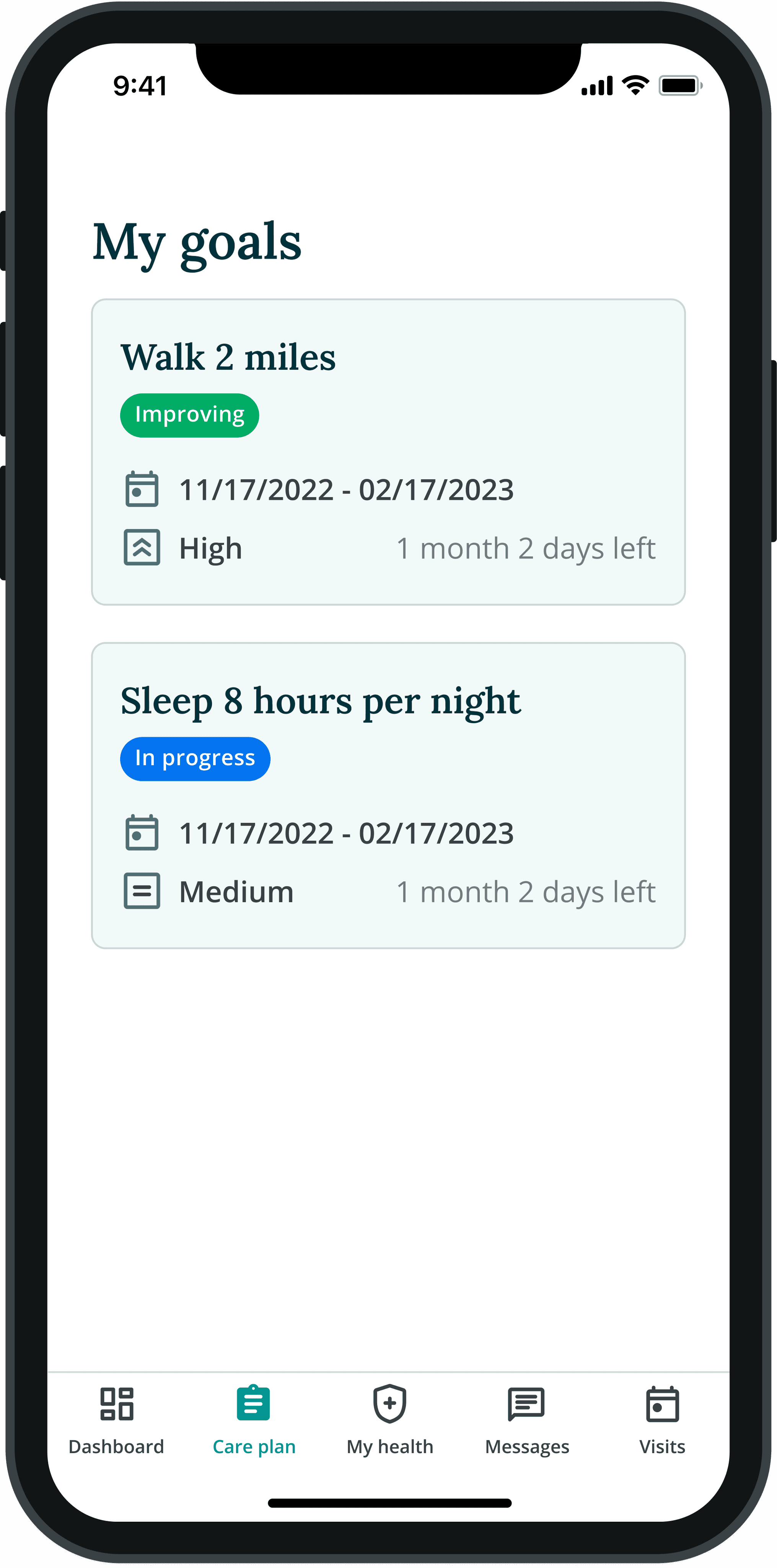 Designed patient journeys across appointments, health-status tracking, messaging, and goal management.