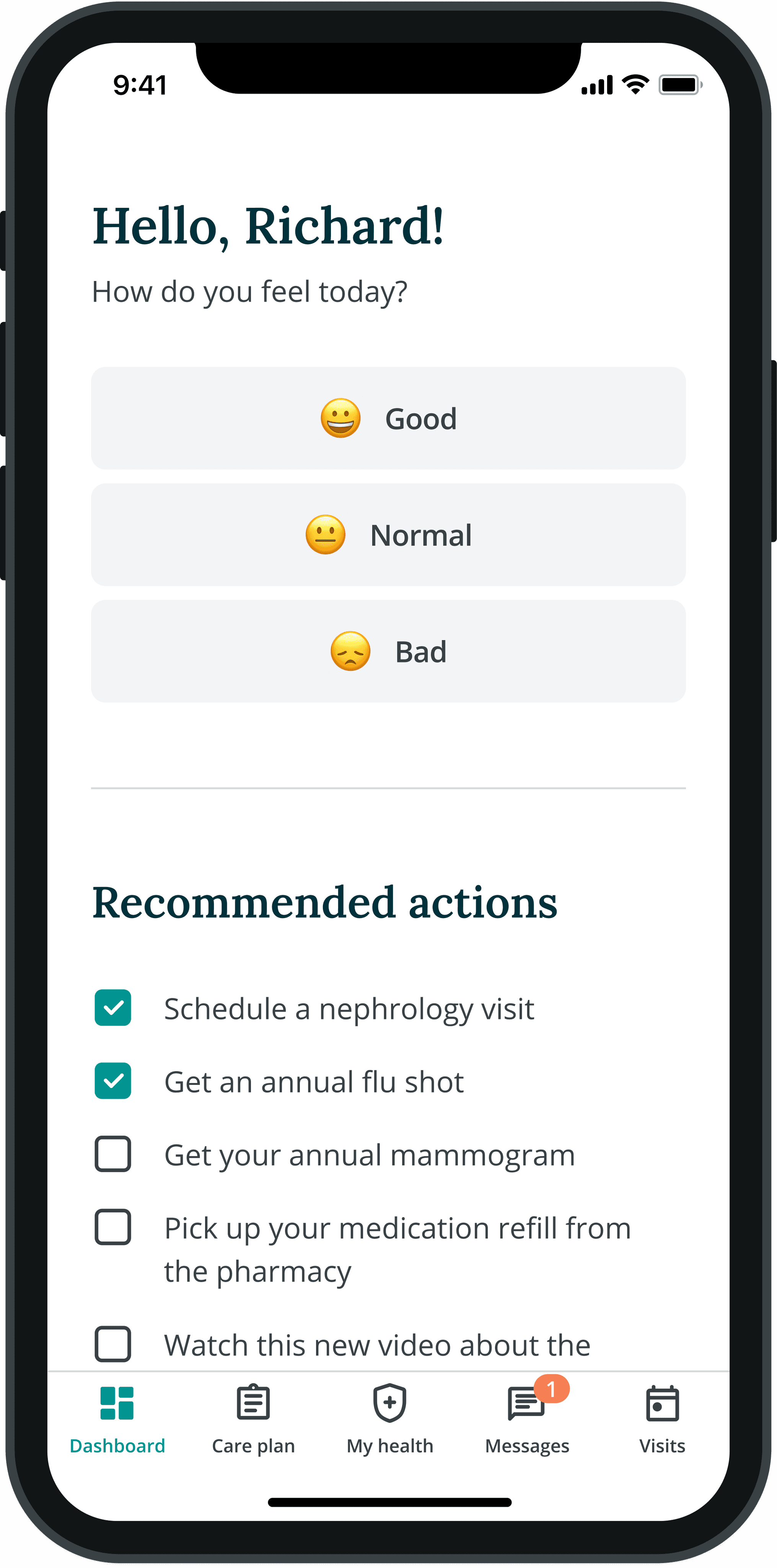 Simplified navigation and prioritized high-value tasks such as messaging and appointment scheduling.